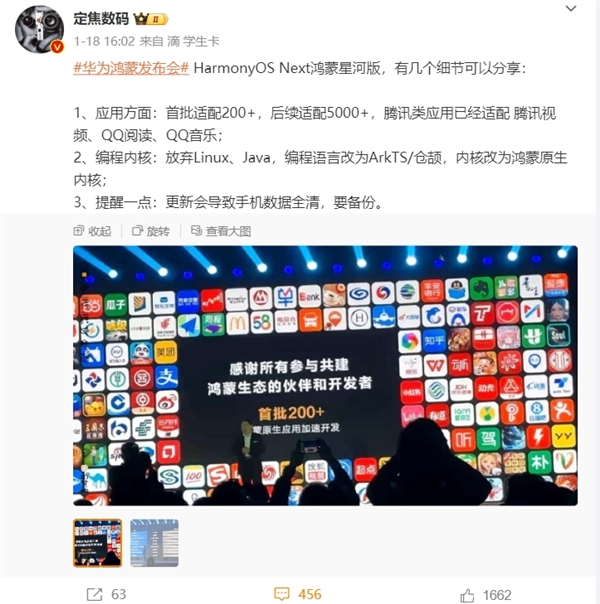最大的变化是,放弃Linux、Java,编程语言改为ArkTS/仓颉,内核改为鸿蒙原生内核。