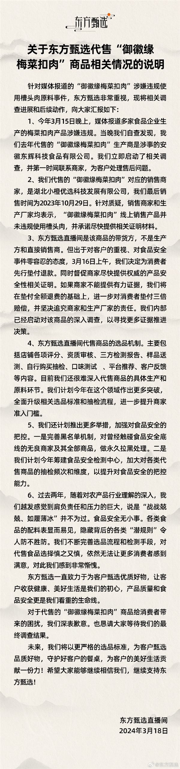 3月18日消息,今日,就其代售御徽缘梅菜扣肉一事,东方甄选对通过官微发布了声明。