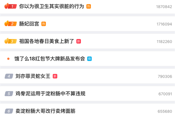 昨天下午,微博热搜前 6 里,淀粉肠独占 3 席。