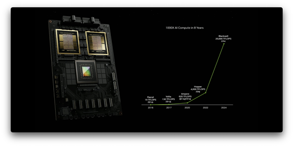 在GPU硬件方面,英伟达在全球GPU市场中持续保持领先。Blackwell的性能比2年前的Hopper架构提升了5倍,比8年前的Pascal架构提升了1000倍。
