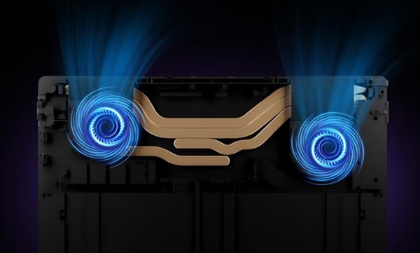 散热方面,其搭载双风扇散热系统,4.0mm超薄双风扇,1mm超薄四热管,0.2mm铝合金鳍片,背面进风,顶部出风,高效散热。