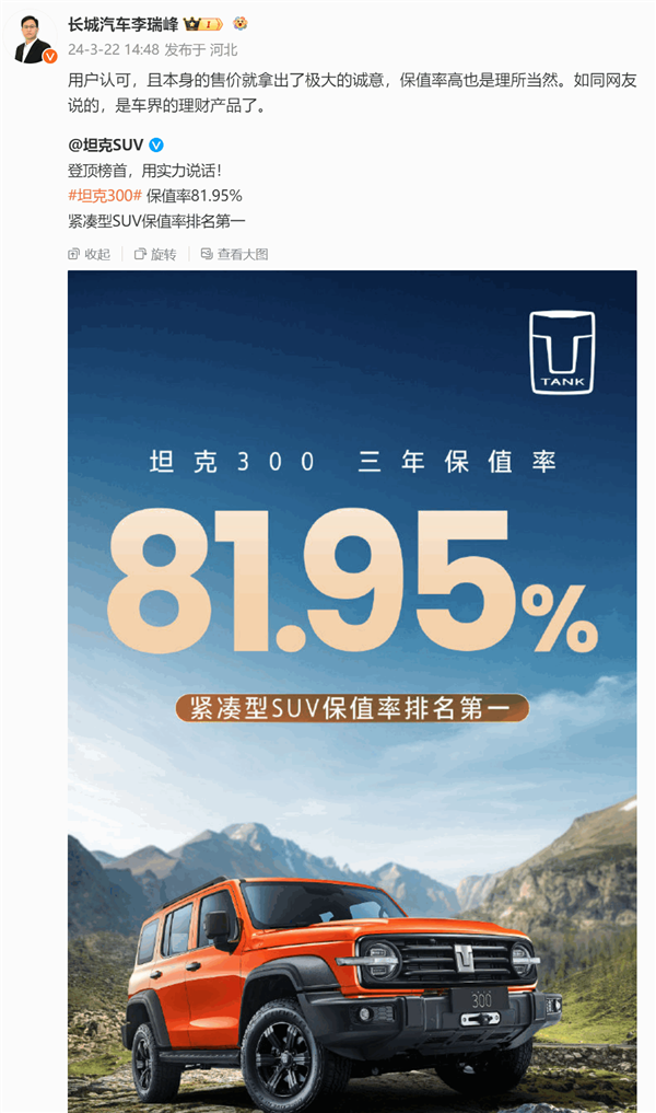 3月22日消息,坦克SUV官方今日发布宣传海报显示,坦克300三年保值率81.95%,问鼎紧凑型SUV保值率排名第一。