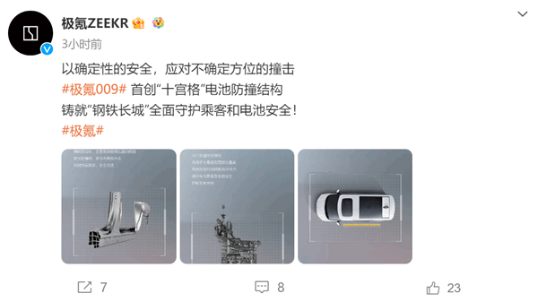 3月22日消息,极氪汽车官方今日发文称,极氪009首创十宫格电池防撞结构,可全面守护电池安全。