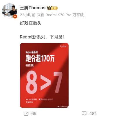至于接下来的红米新机,根据王腾的说法,它将是红米的全新系列,在性能上将搭载骁龙8s Gen3,相较骁龙7+ Gen3有着更好的表现。