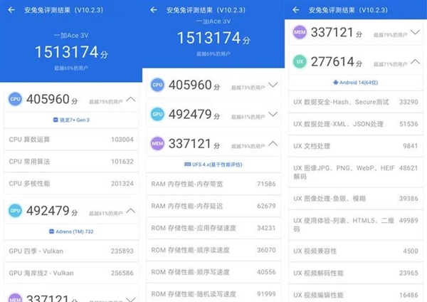 一加在自己的各大系列都卷过性能,所以作为新机的一加 Ace 3V,性能方面肯定不拖后腿。这次的性能铁三角为:芯片是首发搭载第三代骁龙 7+ 移动平台,内存、闪存组合是满血版 LPDDR5X + UFS4.0。