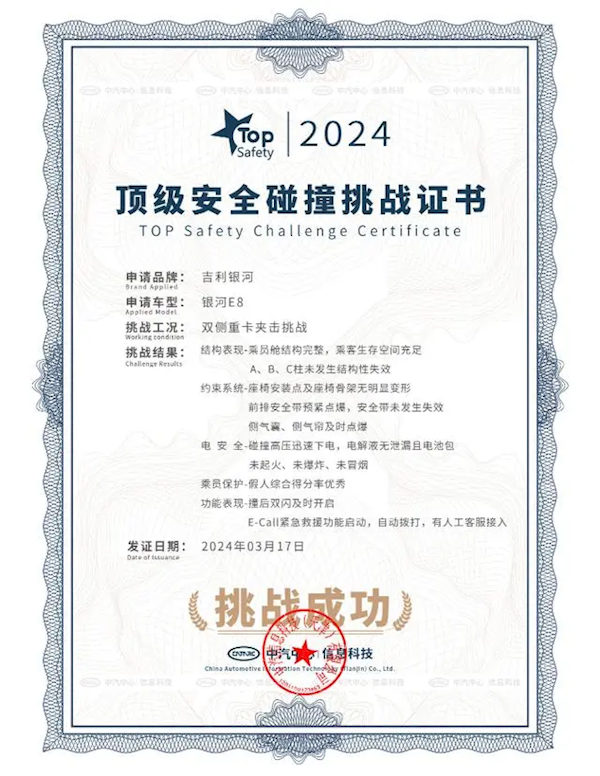 3月25日消息,吉利银河E8今日在中汽中心安全试验室,成功挑战行业首次上演的20吨失控重卡夹击侧碰测试。