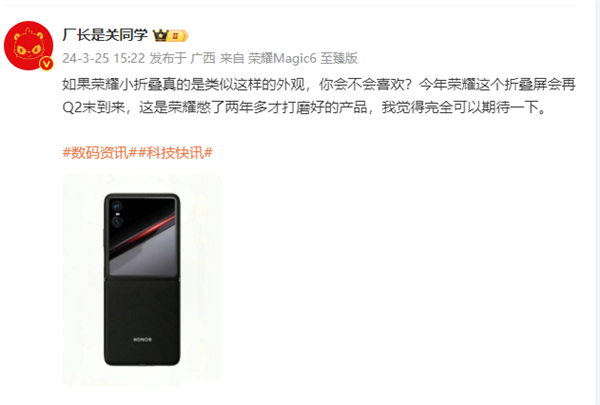 今天,数码博主厂长是关同学曝光了荣耀小折叠手机产品的大致外观,并称这是荣耀憋了两年多才打磨好的产品,会在今年二季度末期正式发布。