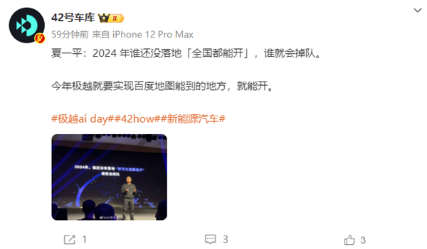 3月25日消息,极越汽车CEO夏一平表示,2024年谁还没落地智驾全国都能开,谁就会掉队,同时其称,今年极越就要实现百度地图能到的地方都能开。