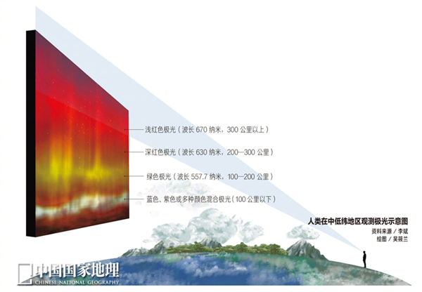 极光高度和颜色的关系,以及我国在内的中纬度地区可视范围示意图。图片来源:中国国家地理