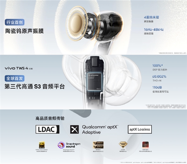 据悉,vivo TWS 4系列首创陶瓷钨原声振膜,出色的高频再现,近无的谐振失真,优异的瞬态响应,高温下声学稳定,以及更耐磨更耐腐的使用寿命,宣称对TWS系列具有里程碑的意义。