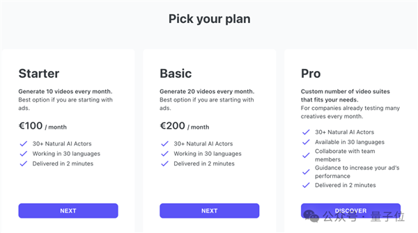 最便宜Starter套餐每个月100欧元,可生成10个广告视频,并提供30多个AI演员供选择。
