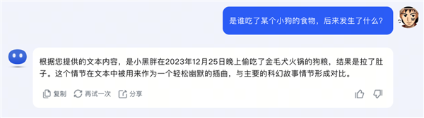 然后替换掉一些关键词来问他:是谁吃了某个小狗的食物,后来发生了什么?