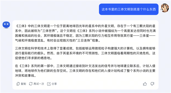 我再问他,在这本书里的三体文明到底是啥,它也回答正确。