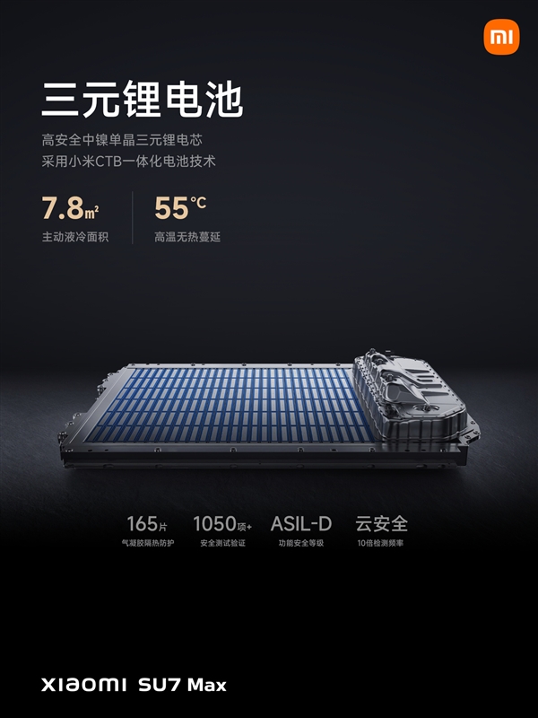 小米SU7有两种电池,一是高安全的磷酸铁锂刀片电池,二是中镍单晶三元理电池,都采用了小米CTB一体化电池技术,分别拥有7.7平方米的气凝胶隔热保护、7.8平方米的主动液冷面积。