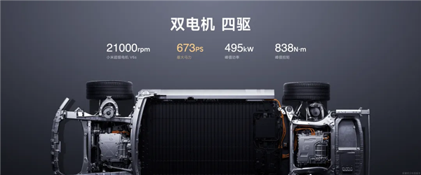小米SU7 Max 版搭载高性能四驱,最高马力 673 PS,峰值扭矩 838 Nm,还有小米超级电机 V6s,转速达到 21000 转,媲美 4.0L 涡轮增压 V8 发动机的跑车。