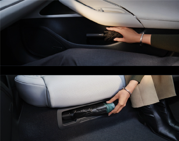 再比如,除了门上有收纳雨伞的插槽以外, SU7 的后排座位下方还有一个隐藏式的雨伞卡槽。再也不用担心湿漉漉的雨伞没地方放了。