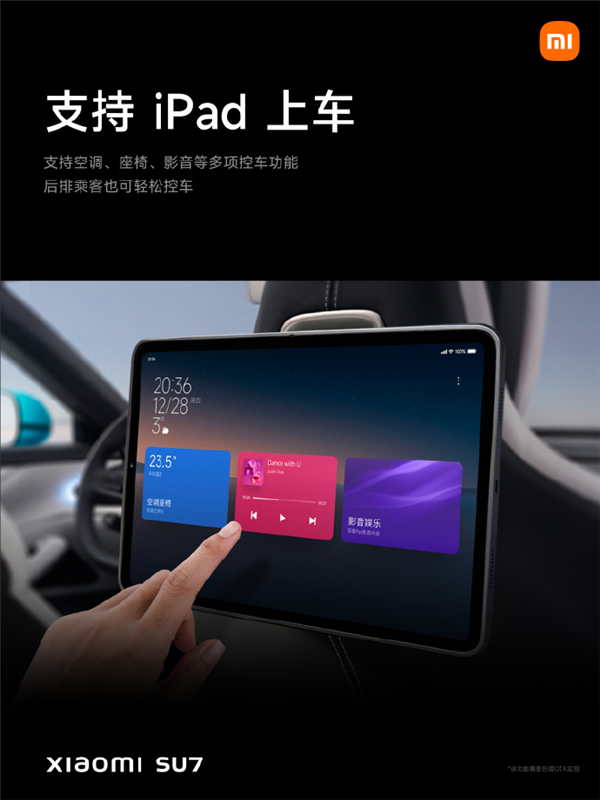 甚至在后排座椅上, SU7 还设计了平板外挂的接口,插上小米的平板就能变成车机的拓展屏幕。