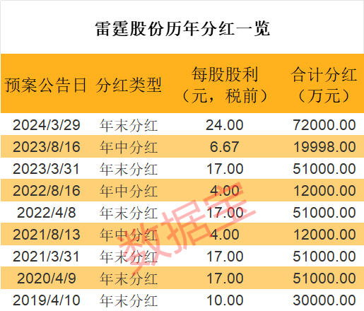 雷霆股份一直保持大额分红的惯例。公司近几年均实施年度10派170元的分红方案,且近年每年度坚持2次分红。2023年半年度推出每10股派发现金红利66.67元,合计分红近2亿元。