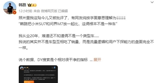 韩路解释称:我并不是说小米汽车有多顶级,但它的知名度和用户基础实在太大了,比现在最火流量四天王:华为、理想、比亚迪、特斯拉,还火几十倍甚至百倍。所以,任何车企,只要还有一丝社交媒体运营思考的,都明白上市那天之后,整个流量场意味着什么。