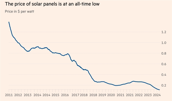 而在这背后,已经跌至十余年前约1/10的太阳能电池板价格,无疑是他们能够如此大面积铺设的终极凭仗。