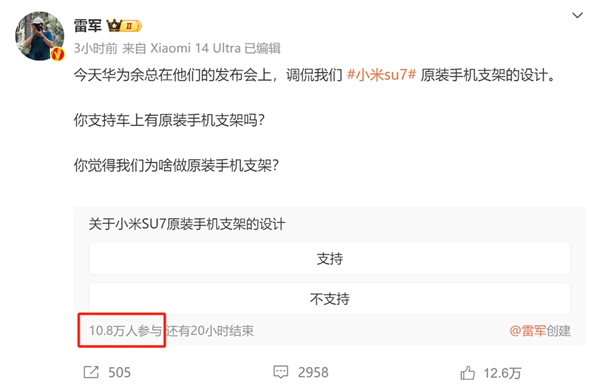 巨头之间的互动总是温情脉脉的。在余总提出问题的几十分钟后,小米创始人、董事长兼CEO雷军在微博上进行了回应。一贯对质疑笑脸相迎的雷总还顺手发了条投票,一下子就吸引了快11万人投票。