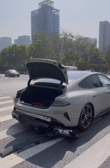 被撞的小米SU7 Max车辆为雅灰色,塑料后杠脱落,右后轮空气悬架的储气罐也被撞掉。然而,厚重的后防撞钢梁未出现明显形变,表明并未造成严重损伤。