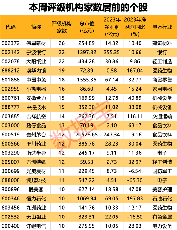 本周,机构关注度最高的是伟星新材,达26家;宁波银行、太阳纸业均有22家机构关注。另外,澳华内镜、中国中免、小熊电器、安徽合力、中控技术均有15家及以上机构关注。