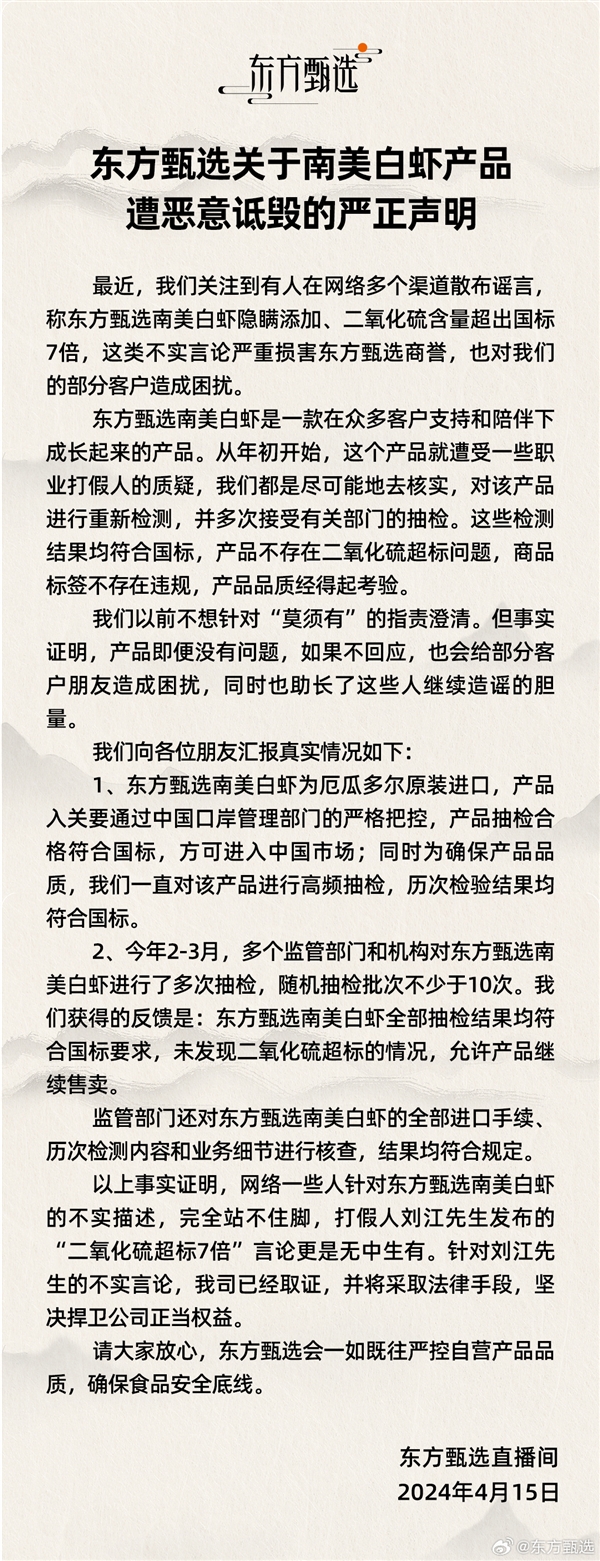 最近,我们关注到有人在网络多个渠道散布谣言,称东方甄选南美白虾隐瞒添加、二氧化硫含量超出国标7倍,这类不实言论严重损害东方甄选商誉,也对我们的部分客户造成困扰。