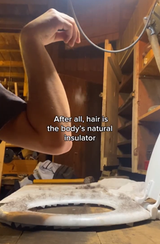 起因也是女朋友和他吐槽,说天气冷的时候坐在马桶上有些凉,于是他灵机一动后就机灵地动了一小下,准备用自己的体毛温暖女友的屁股。