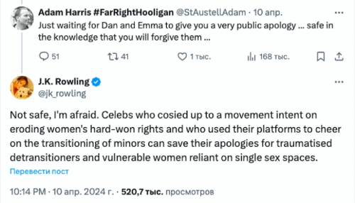 J.K.罗琳则回复道:恐怕不会。那些支持剥夺来之不易的女性权利运动、利用自己的平台支持未成年人变性的名人,可以把道歉留给那些受到创伤、后悔变性的人和女性。