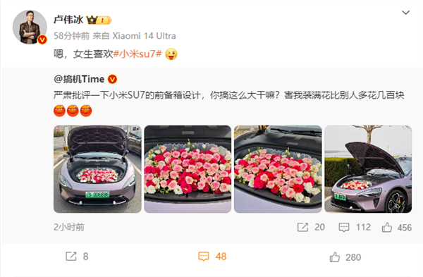 他分享的图片显示,一束庞大的玫瑰花束完美地填满了小米SU7宽敞的前备箱,与车身的霞光紫色相映成趣,营造出一种非凡的浪漫氛围。