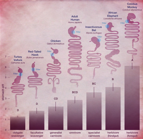 杂食性动物的胃环境平均 pH 约为 2.9,人类的胃环境平均 pH 数值为 1.5-3.0,像鬣狗、秃鹫这样的食腐动物,它们的胃内 pH 低至惊人的 1.3。