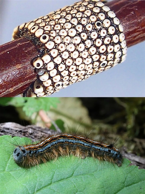 它的成虫叫天幕枯叶蛾,这种蛾产卵很有特点,会将卵环着树枝,排列成顶针状的卵环。