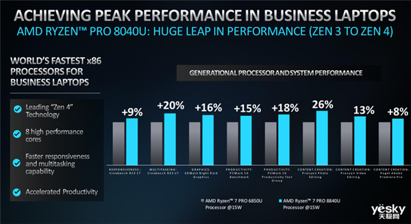 根据AMD公布的数据,锐龙7 PRO 8840U对比锐龙7 PRO 6850U在15W功耗表现下可以带来20%的多线程性能提升,图形性能提升16%;在生产力测试中,如照片编辑提升可以达到26%,视频剪辑提升13%。