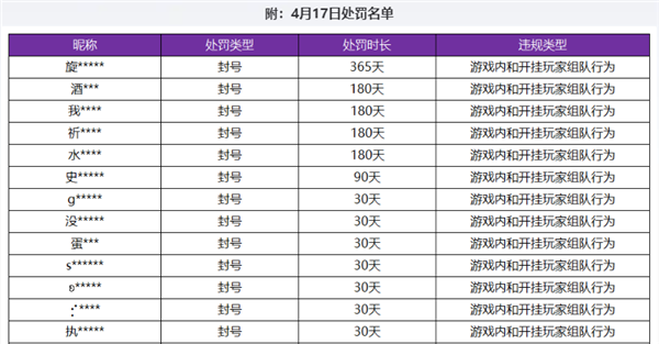 在最新的处罚名单中,有玩家因为与使用外挂的玩家组队,被处以长达365天的封号处理。