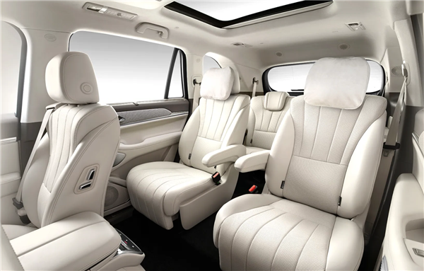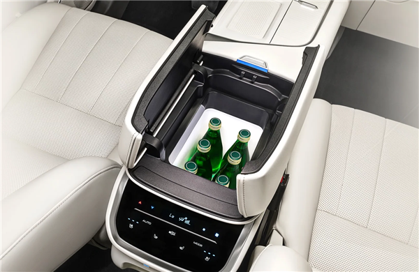 此外,新车在中控扶手箱提供了小冰箱,目测容积不小,可轻松放进去六瓶玻璃瓶矿泉水,后排配备大尺寸的吸顶折叠屏,满足乘客娱乐需求,同时大量采用软包面料包裹,浅色系内饰则带来更加柔和的视觉效果。