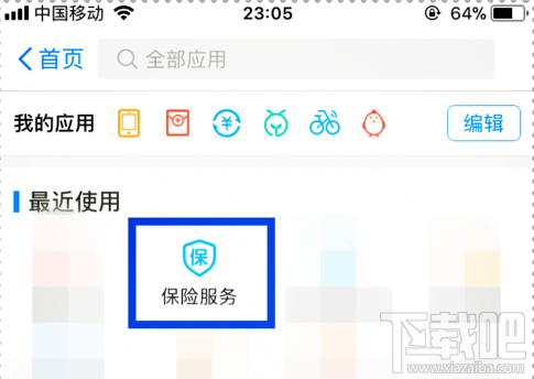 2.进入支付宝界面。如果你平时用它支付,可以在支付点进去,找到健康水果礼品界面,然后点击领取;您也可以直接从程序进入更多-保险服务。