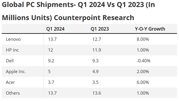 4月22日消息,根据市调机构CounterPoint的最新报告,2024年第一季度全球PC市场结束了连续八个季度的下滑趋势,同比增长约3%。
