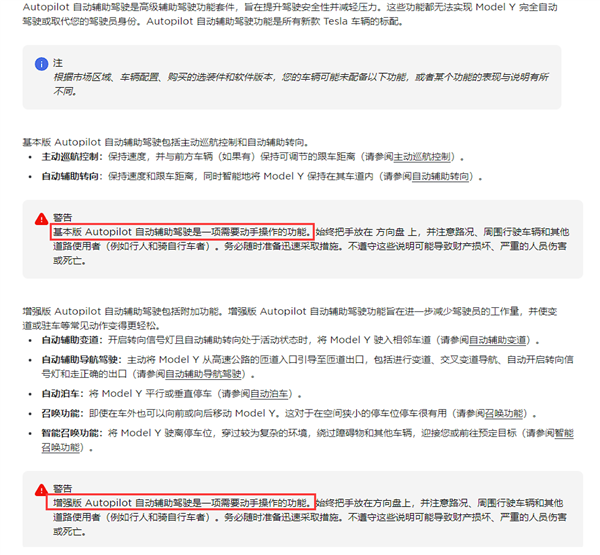 但需要提醒的是,特斯拉官网明确写道,无论是基础版还是增强版,都是一项需要手动操作的功能,开启过程中需要将手始终放在方向盘上,并注意路况,随时接管车辆。