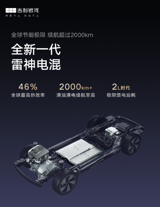 动力系统方面,银河星舰概念车搭载了吉利最新自主研发的三电系统,也即新一代雷神电混技术,发动机热效率超46%,将馈电油耗带入2L时代,整车续航里程可超2000公里,官方表示,明年雷神电混技术会并搭载在银河星舰量产版之上。