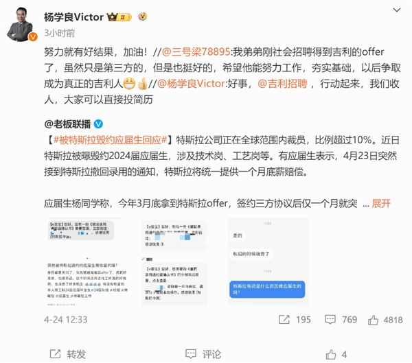 日前,吉利控股副总裁杨学良,在转发应届生被特斯拉毁约的新闻时表示,这是好事,并在线@吉利招聘,吉利行动起来,我们收人,大家可以直接投简历。