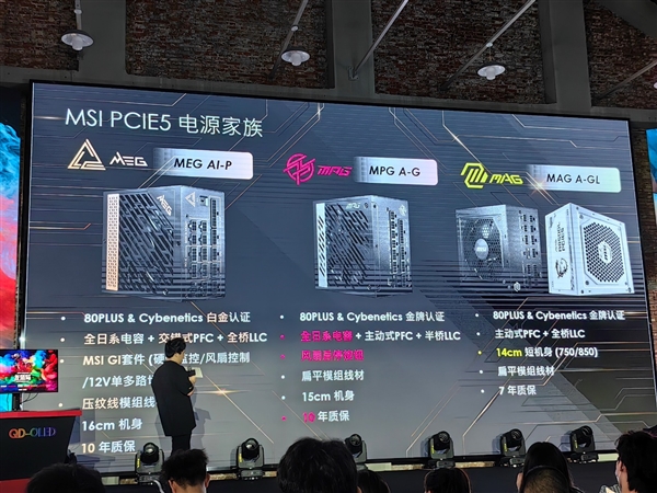 电源方面,微星已经形成了完成的PCIe 5.0家族,其中顶级的MEG AI-P通过了80PLUS Cybeneitcs白金认证,配备全日系电容、交错式PFC、全桥LLC、12V单多路、压纹线模组线材,提供10年质保。