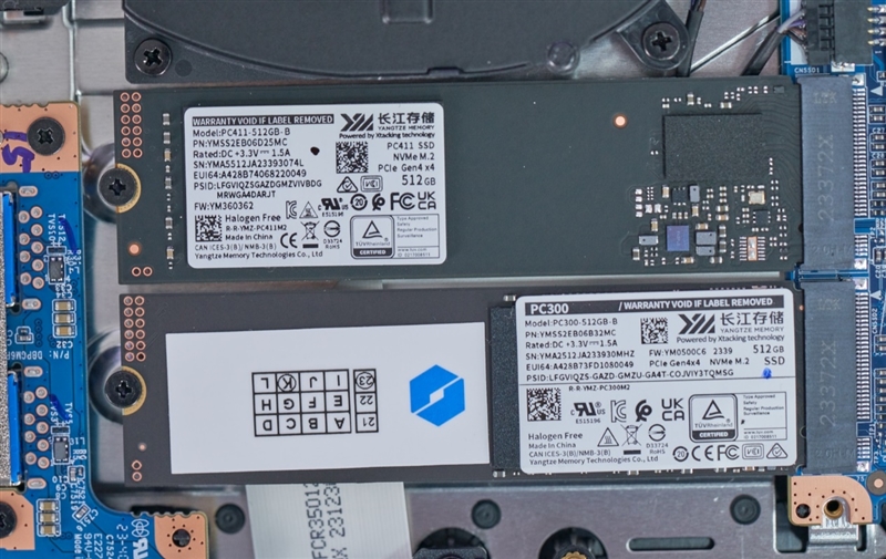 左侧有两个M.2 2280接口,上边插的就是长江存储PC411 512GB SSD。